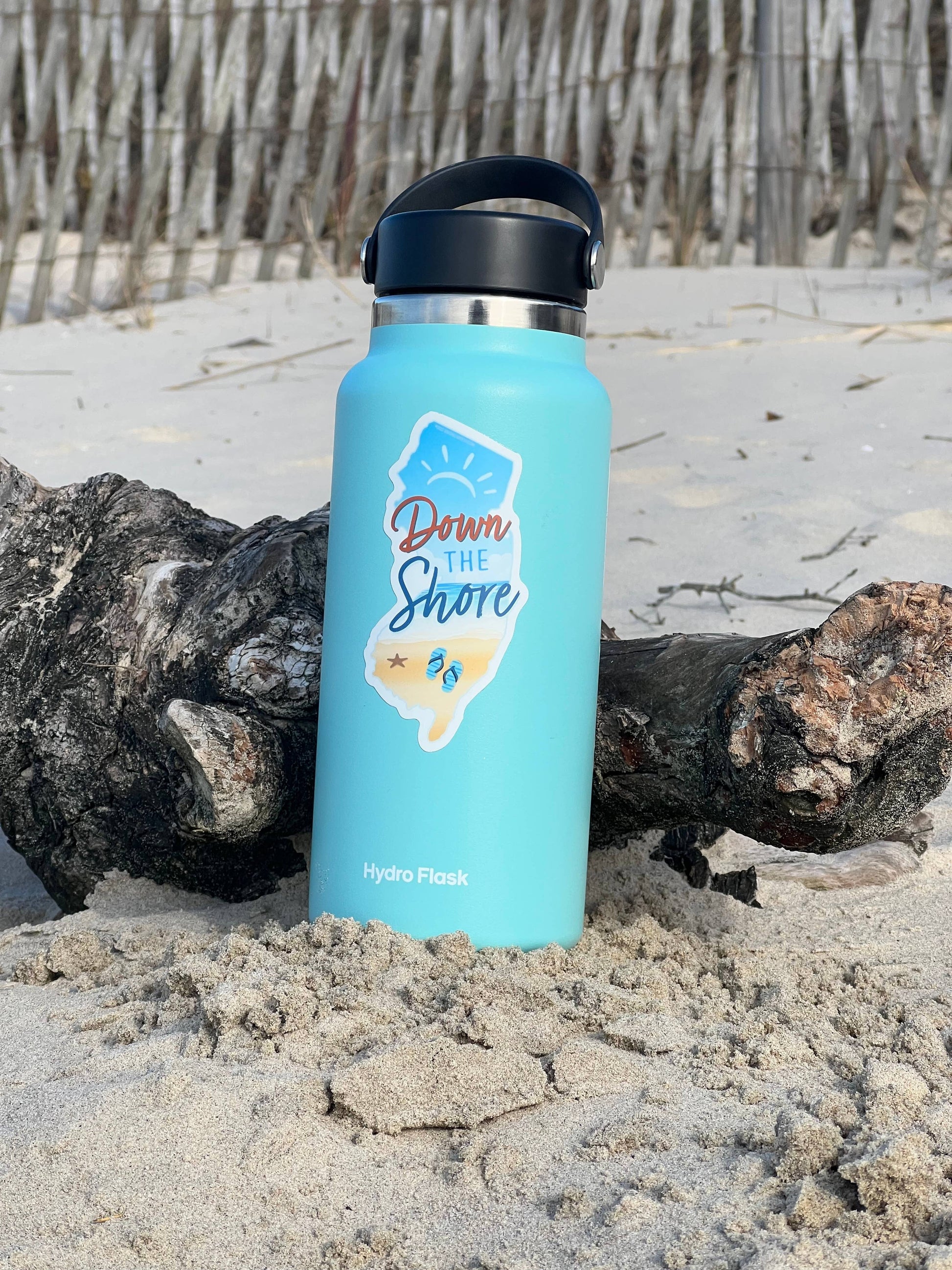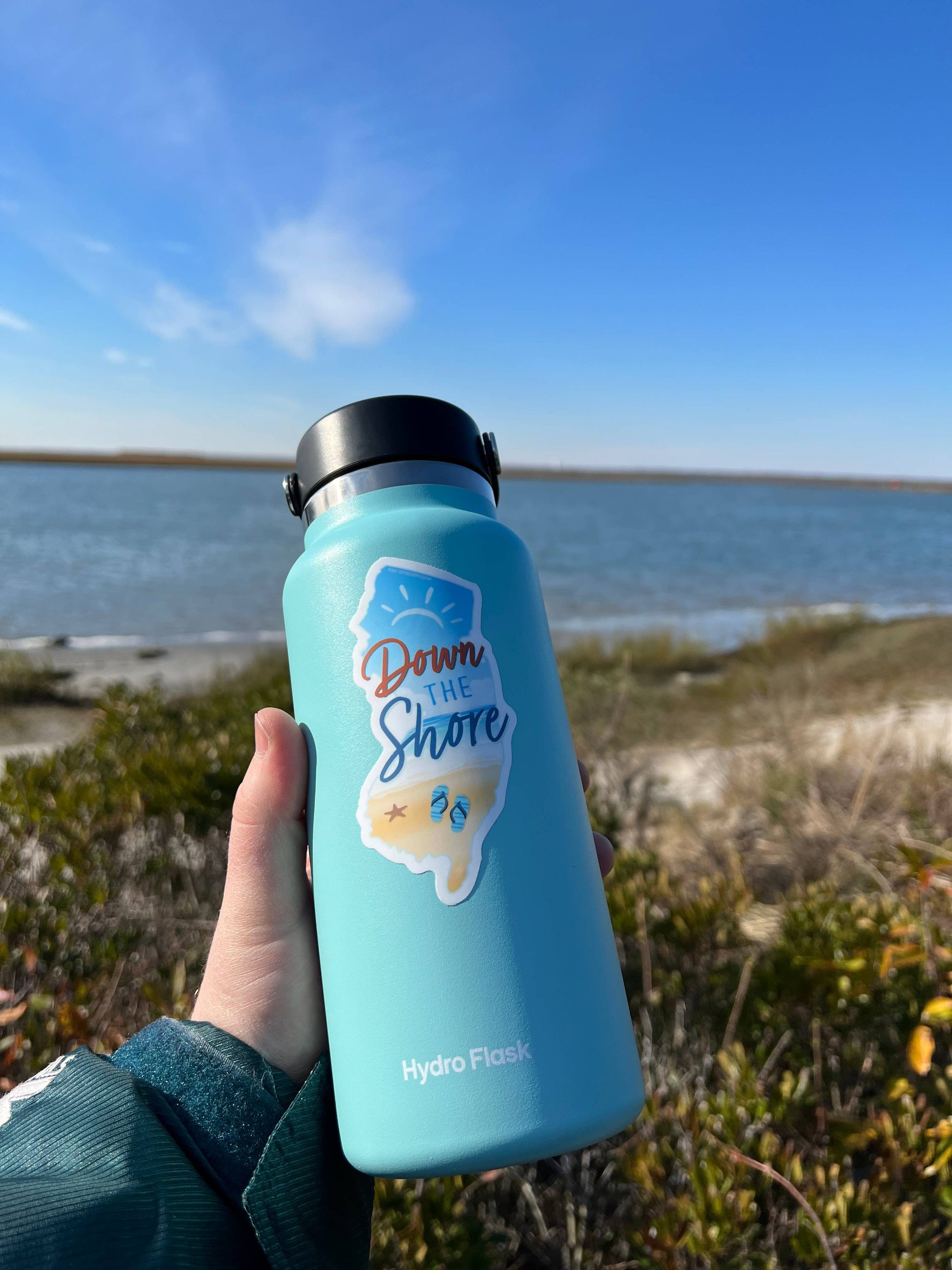 Jersey shore decal for Hydroflask & laptop, 4.25" high laptop decal size. Durable die-cut vinyl decal with a matte UV-resistant coating. Waterproof & weatherproof for indoor & outdoor use. Made in USA. There's nothing better than grabbing a water ice on the boardwalk, kicking back in the sand and enjoying the sound of ocean waves. Celebrate this classic NJ quote with a Down the Shore sticker. This cute NJ bumper sticker is a perfect souvenir whether you're a lifelong Jersey girl, recent transplant, or just visiting the beautiful New Jersey shore.