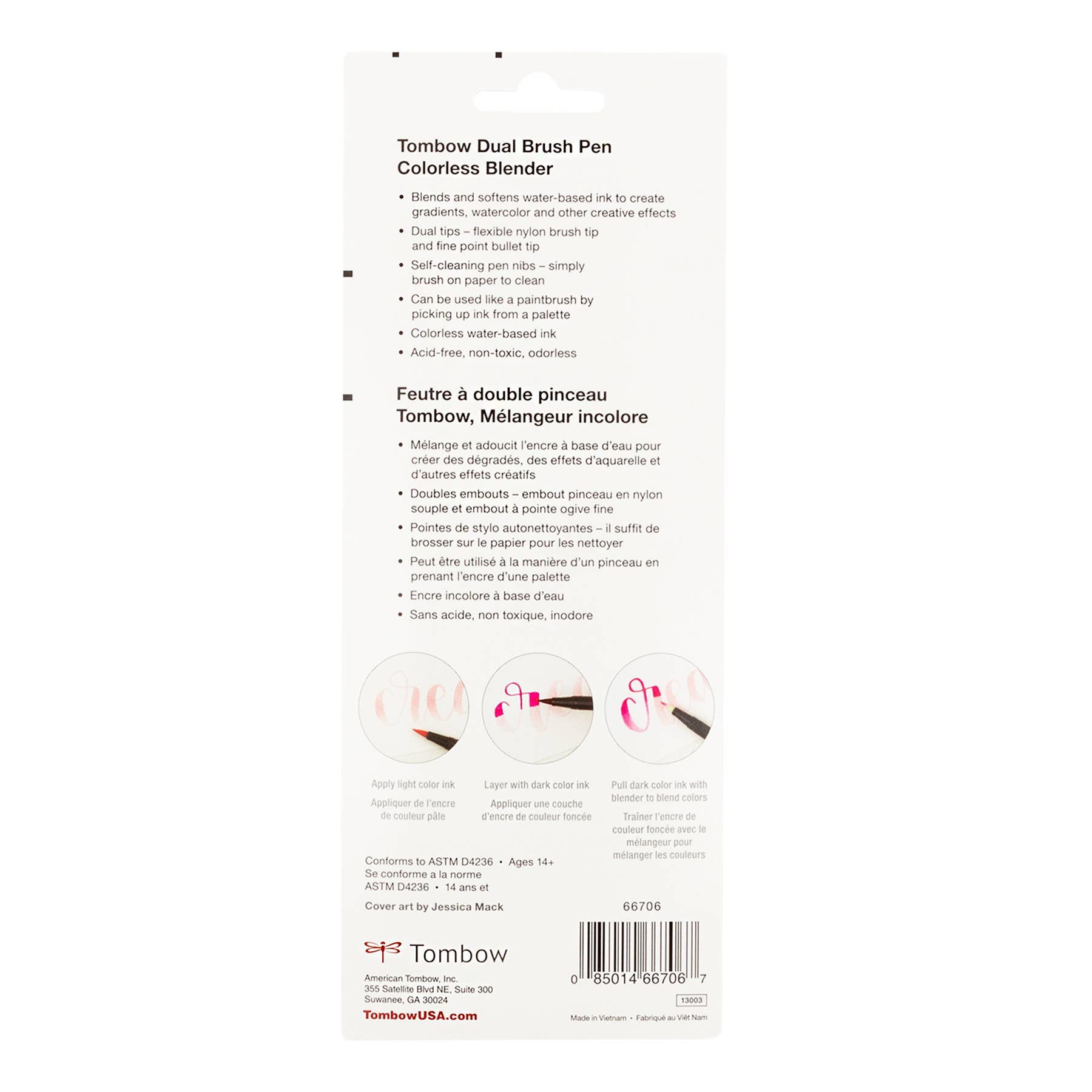 Set of 3 water-based colorless blender pens. Use with colored Dual Brush Pens to blend ink to create watercolor effects and gradients. Flexible brush tip and fine tip in one marker. Brush tip works like a paintbrush to create fine, medium, or bold strokes; fine tip gives consistent lines. Resilient brush tip retains its point stroke after stroke. Tips self-clean after blending.