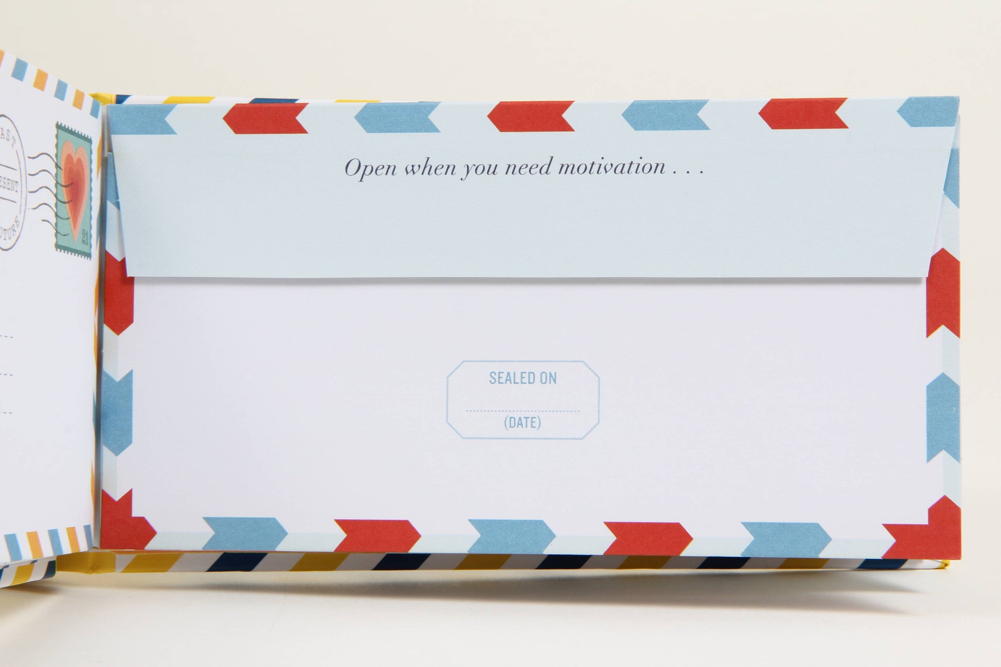 • Each letter is printed with a unique prompt like "Open when you're looking for inspiration…," "Open when you need a pep talk…," "Open when you need to make a big decision…," and "Open when you need a good laugh," plus two blank letters to write your own