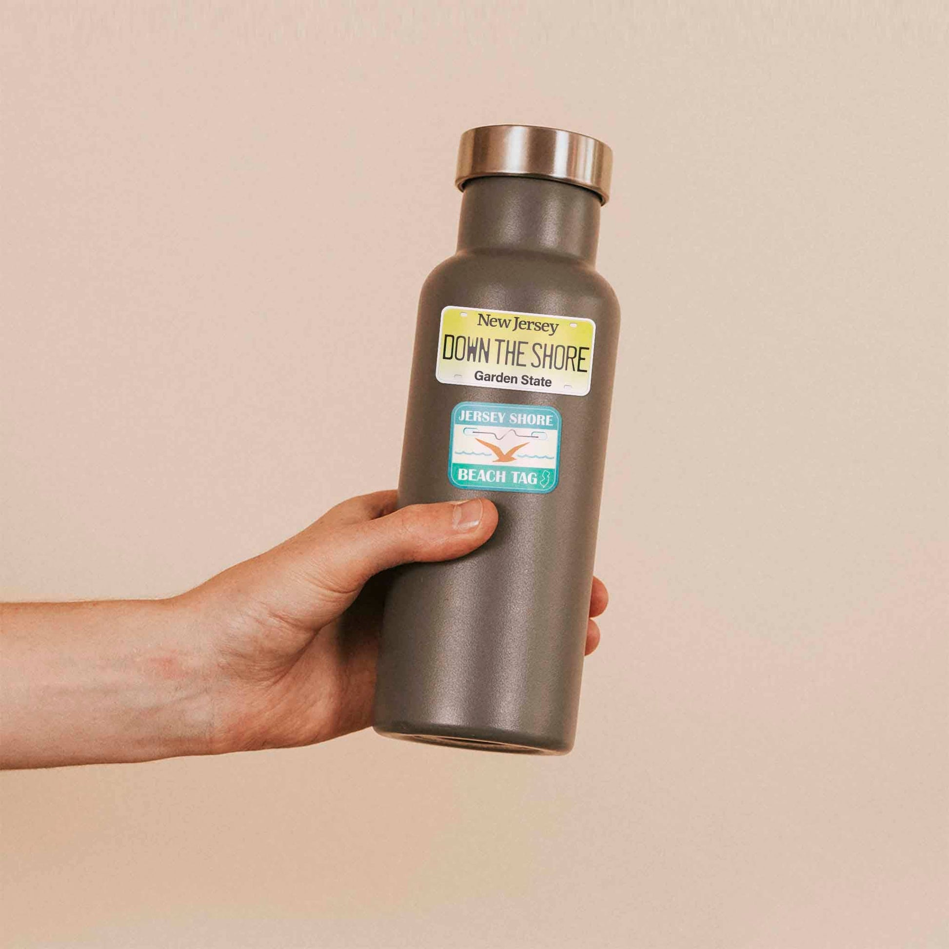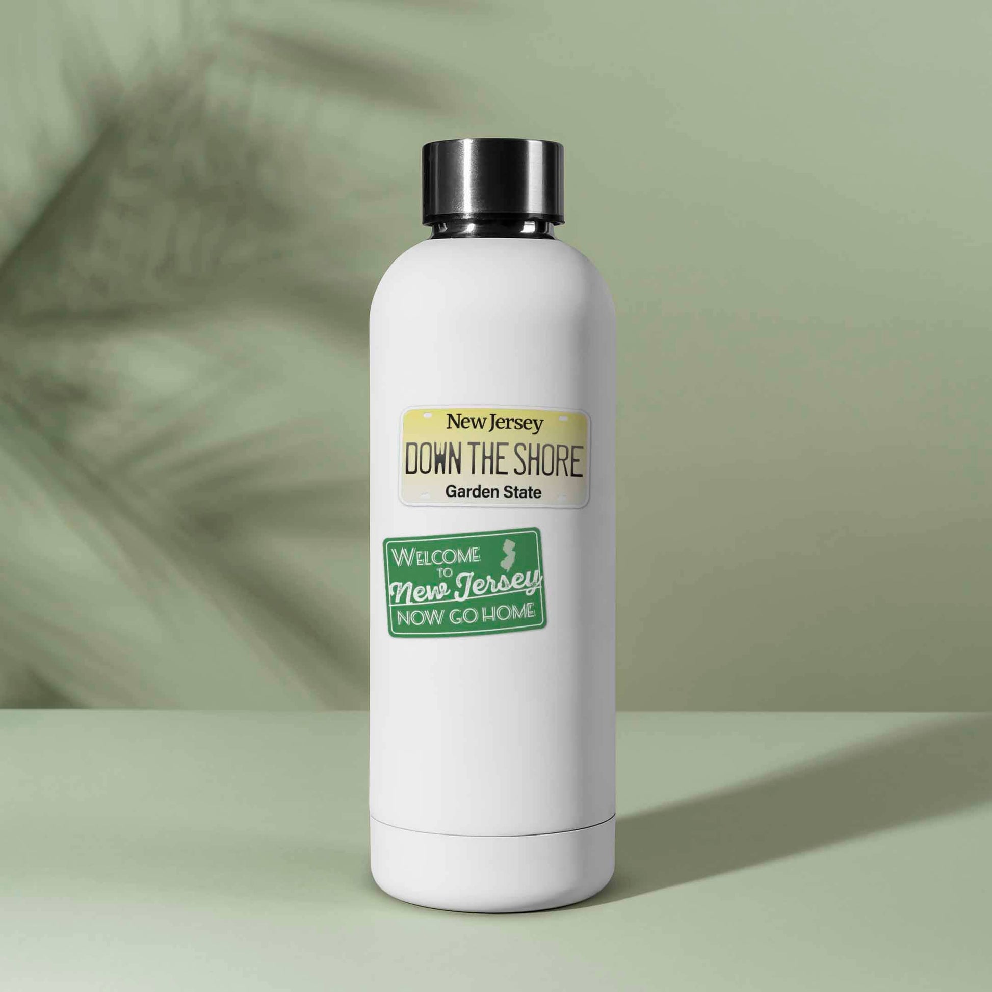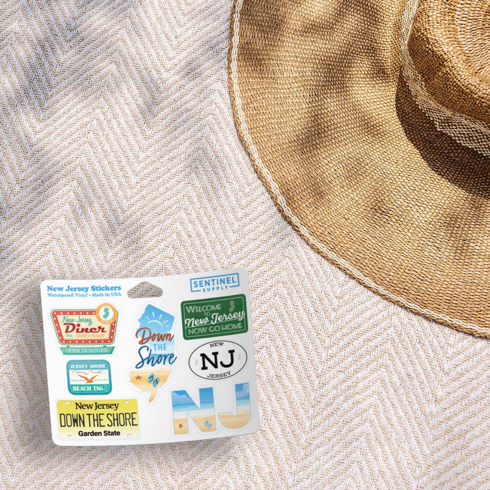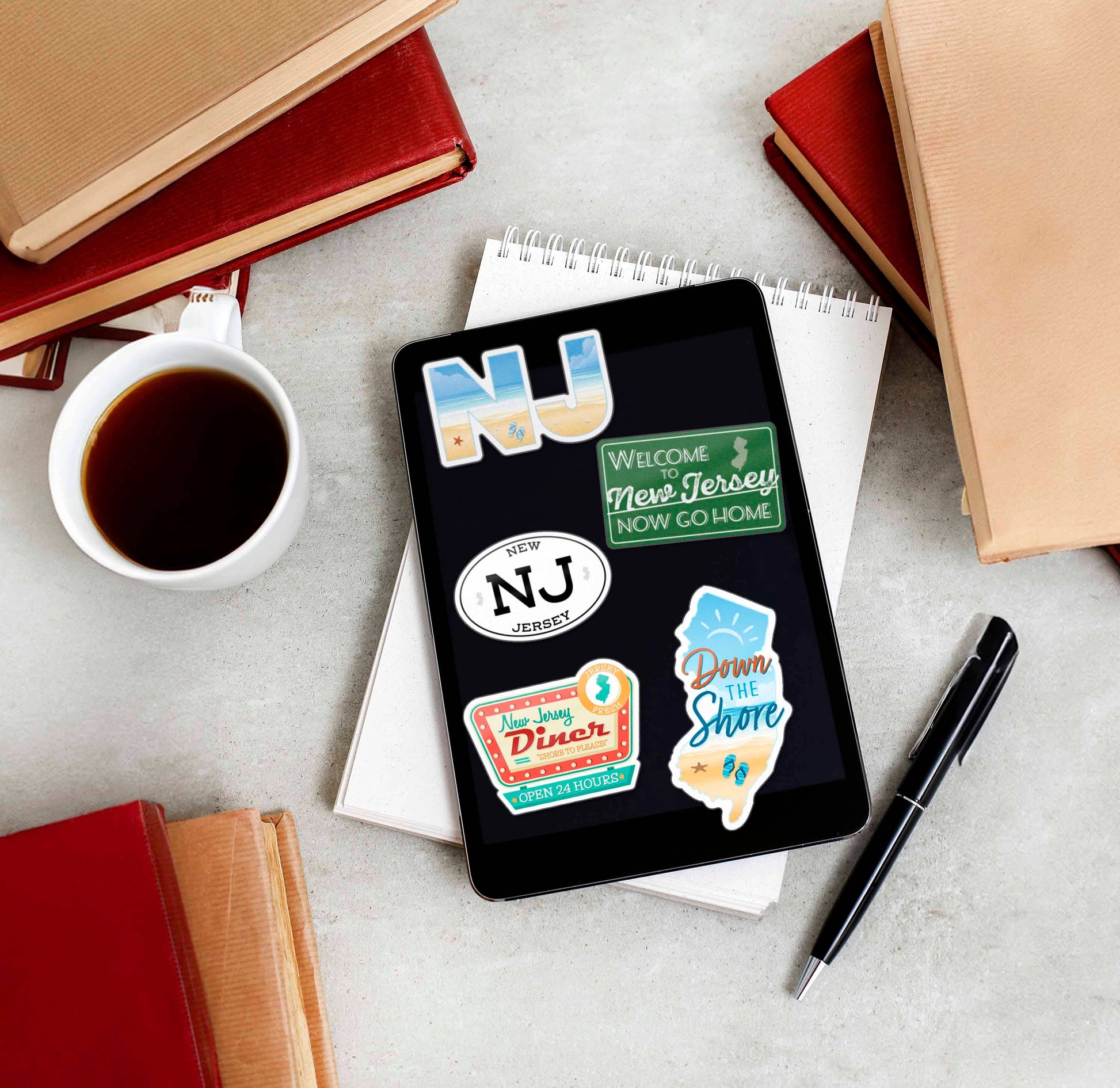 NJ sticker set of 7 mini laptop decals. Total dimensions: 5" wide x 4" high. Durable die-cut vinyl decal with a matte UV-resistant coating. Waterproof & weatherproof for indoor & outdoor use. Made in USA. Celebrate the Garden State with a cool NJ sticker pack! Features 7 mini versions of our Jersey shore stickers: Jersey Fresh Retro Diner Sign - 1.75" W Jersey Shore Beach Tag - 1" W Down the Shore NJ License Plate - 2" W Down the Shore NJ Map - 2.5" H Welcome to New Jersey Now Go Home - 1.5" W NJ White Oval - 1.5" W NJ Beach - 2" W