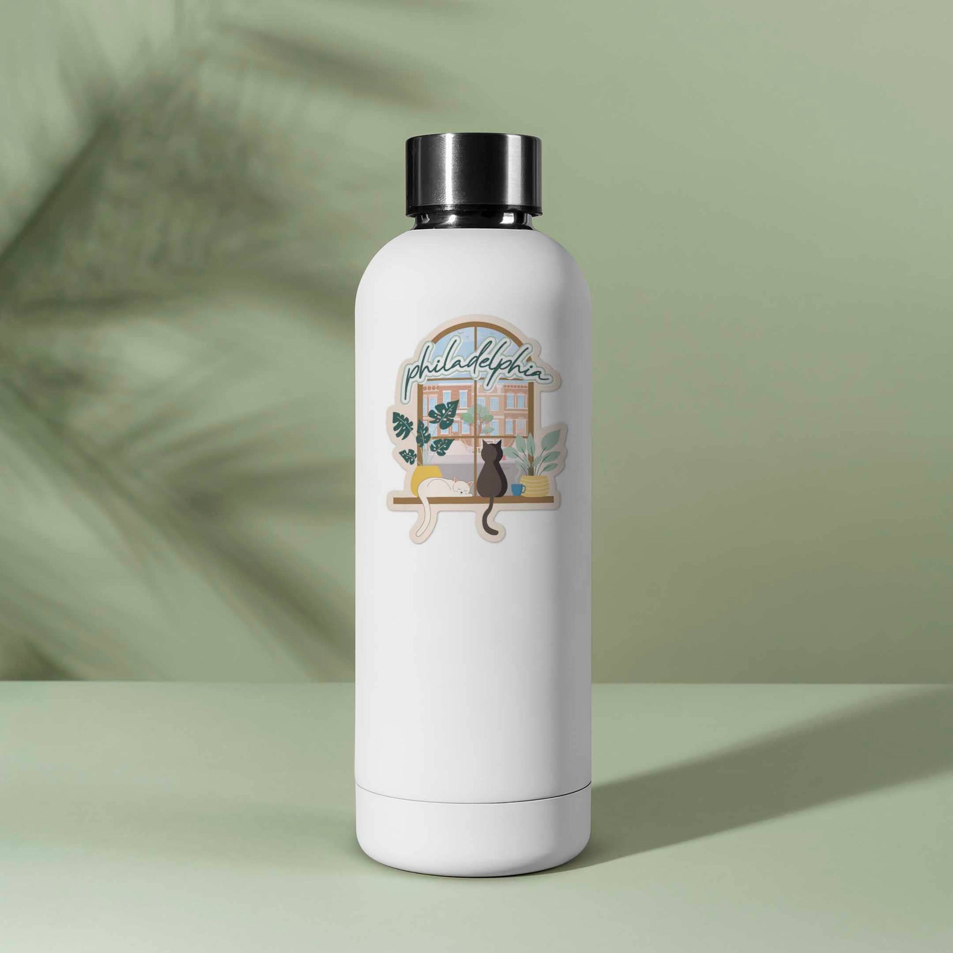 Philly Plants & Window Cats sticker, 3" laptop decal size. Durable die-cut vinyl decal w/ matte UV-resistant coating. Waterproof & weatherproof for indoor & outdoor use. Made in USA. Any pedestrian in the City of Brotherly Love knows the rowhouse window sill is prime real estate for kitties to spot birds & soak up some sun. Celebrate Philly rowhomes & their iconic window cats with a cute sticker featuring a black cat, white cat, & potted plants on a classic Philly neighborhood street. A vinyl decal makes a great Philly souvenir or gift for cat owners, animal rescue volunteers, or that one friend who squeals at every window cat they see.