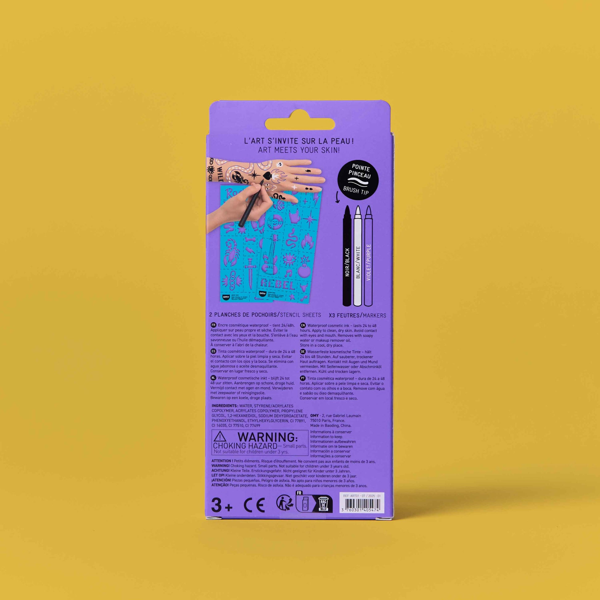 Ink Markers and stencils Tattoos kit Express your creativity with these markers (black, white, and purple) specially designed for the skin. Their ink dries quickly and lasts up to 2 days without smudging. The brush tip lets you draw fine or thick lines, fill in areas, or add precise details. The kit includes 25 stencils to guide or inspire your creations. Perfect for creating unique temporary tattoos, whether freehand or using the stencils. 💧 Easily removes with soapy water or a bit of makeup remover.