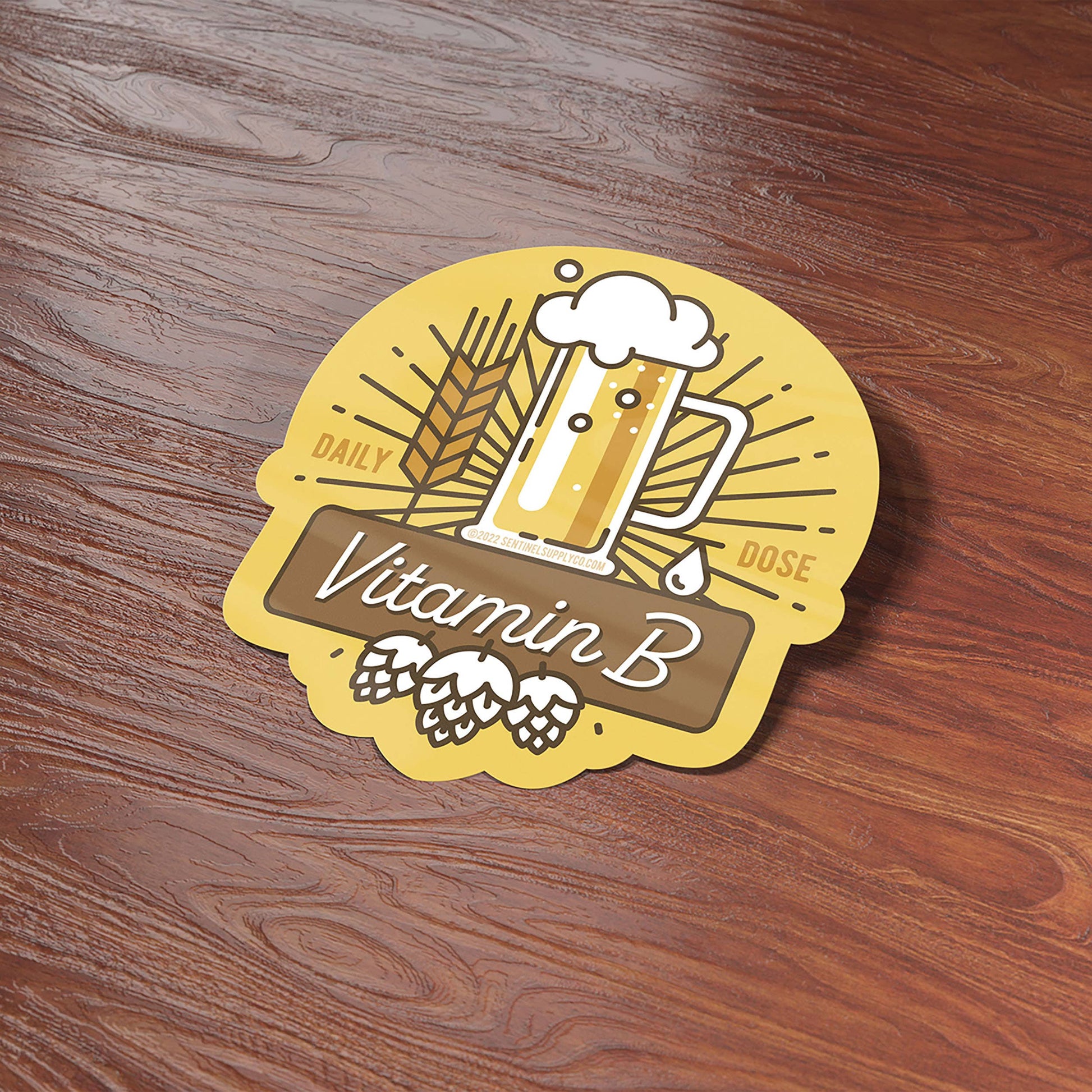 Vitamin B beer sticker, 3.25" wide x 3" high laptop decal size. Durable die-cut vinyl decal with a matte UV-resistant coating. Waterproof & weatherproof for indoor & outdoor adventures. Made in USA. Have you had your daily dose of Vitamin B? Make sure you don't forget this crucial nutrient by placing this funny beer sticker on your growler or insulated cup. Featuring a frosty beer mug, hops, and wheat, this yellow sticker makes a great gift for beer lovers, IPA drinkers, and home brewing enthusiasts. Perfect waterproof decal for Hydroflask, insulated tumbler, keg, or cooler. Designed & printed in North Texas.