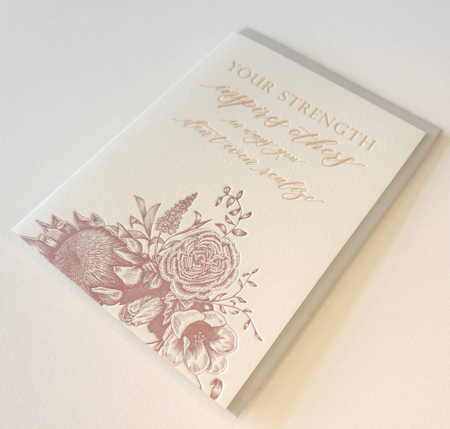 "Your Strength Inspires Others" Sentimental letterpress greeting card to let someone special know that their strength inspires others in ways they don't even know. Original floral artwork created by Rust Belt Love. These two color cards are handmade and pressed one at a time on antique presses. Premium quality cotton paper.